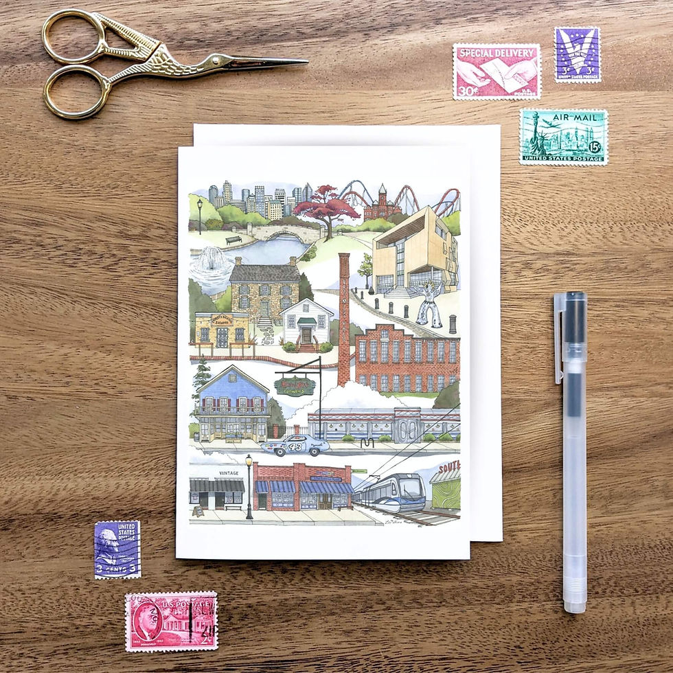 These notecards feature original artwork by a pen-and-ink and watercolor artist based in Durham, North Carolina.